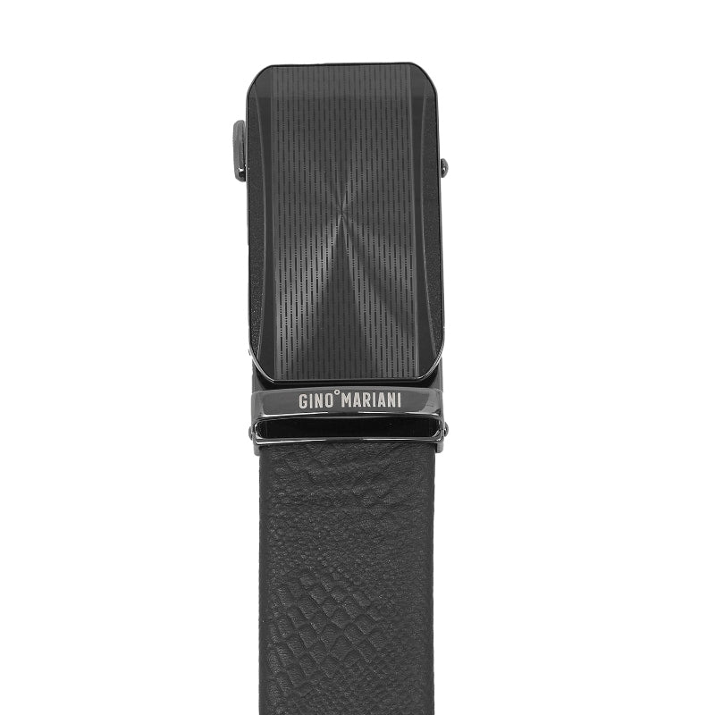 Fitur Utama: - Material: Kulit asli berkualitas, kuat dan awet. - Warna: Hitam klasik, cocok untuk berbagai gaya formal maupun kasual. - Gesper: Gesper otomatis berbahan metal dengan finishing glossy dan motif garis minimalis, memberikan tampilan modern dan mewah. - Desain: Adjustable (dapat disesuaikan panjangnya) untuk kenyamanan maksimal.