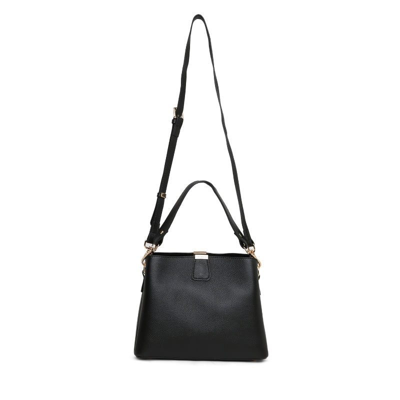 Bentuk bucket yang modern dengan detail penutup snap button dan aksen emas membuat tas ini cocok untuk berbagai kesempatan—dari kasual hingga semi-formal.